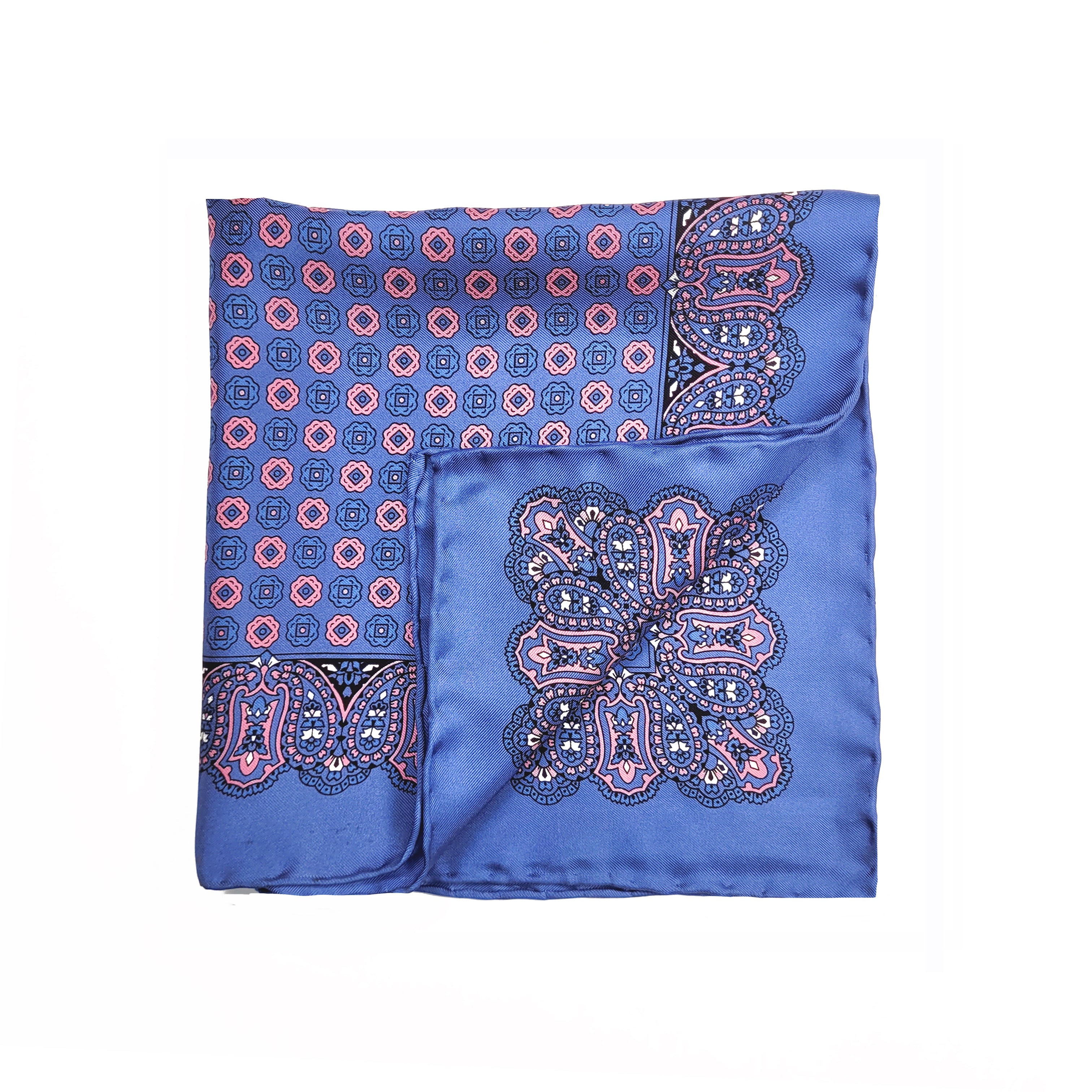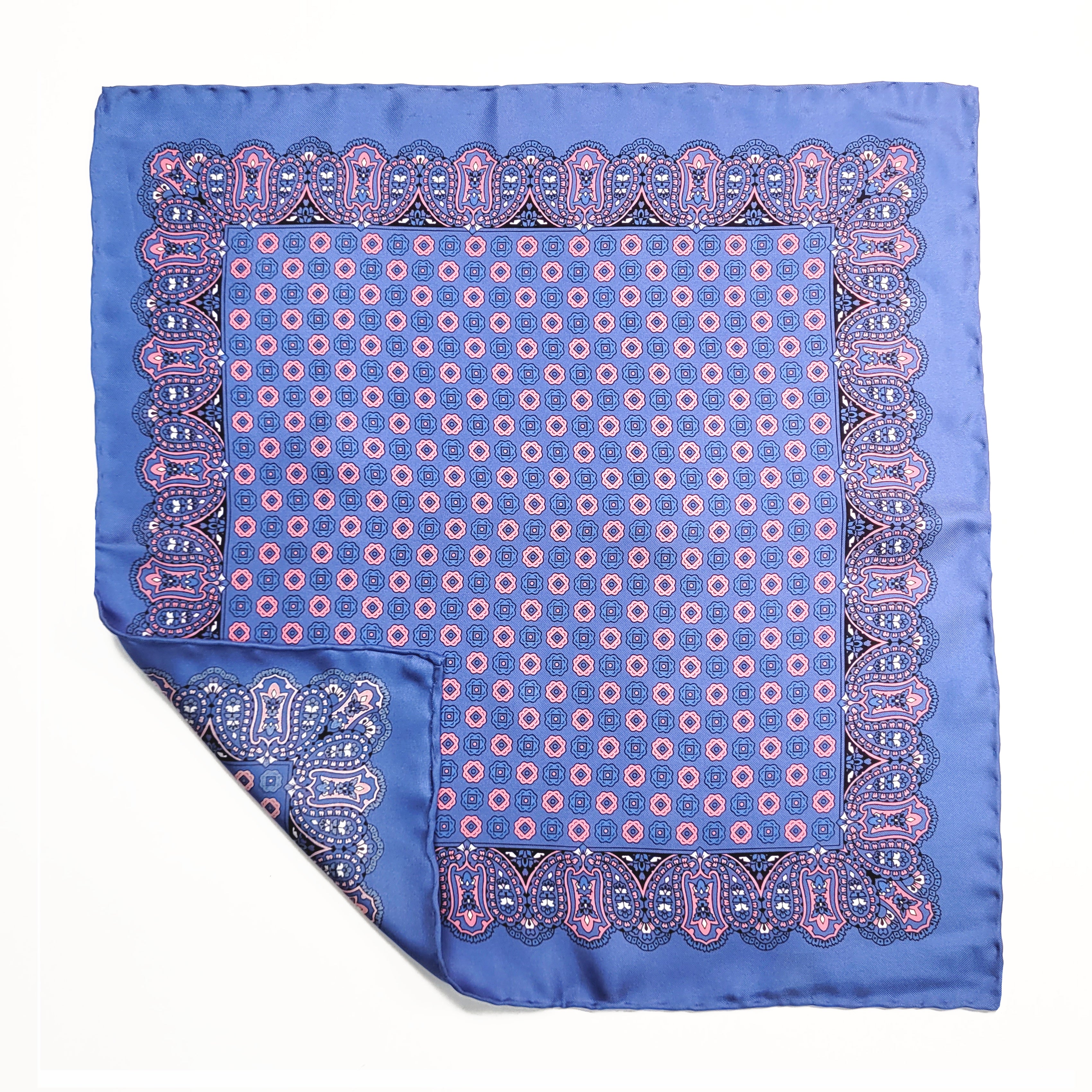 Blue and Pink Geometric Silk Pocket Square with Paisley Border