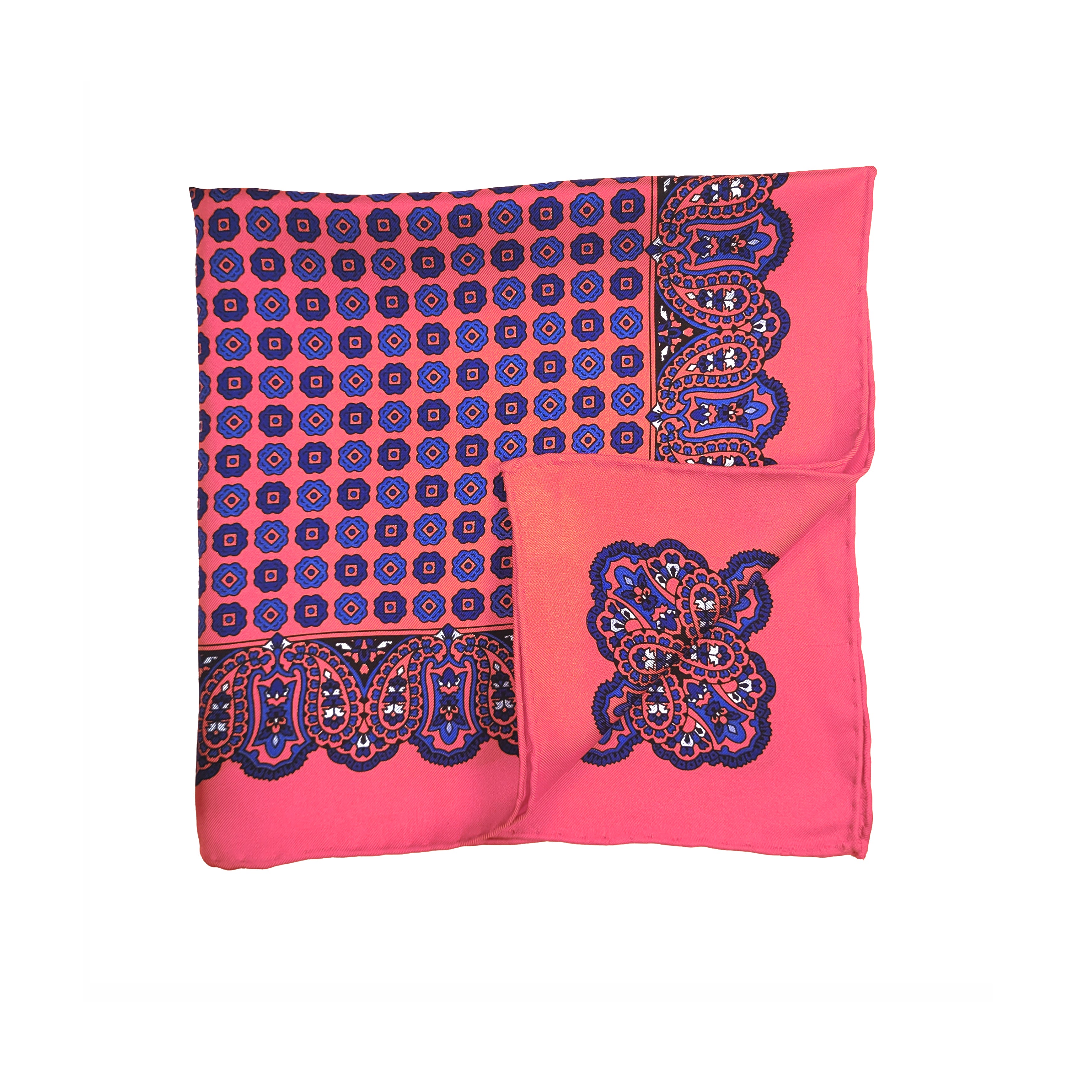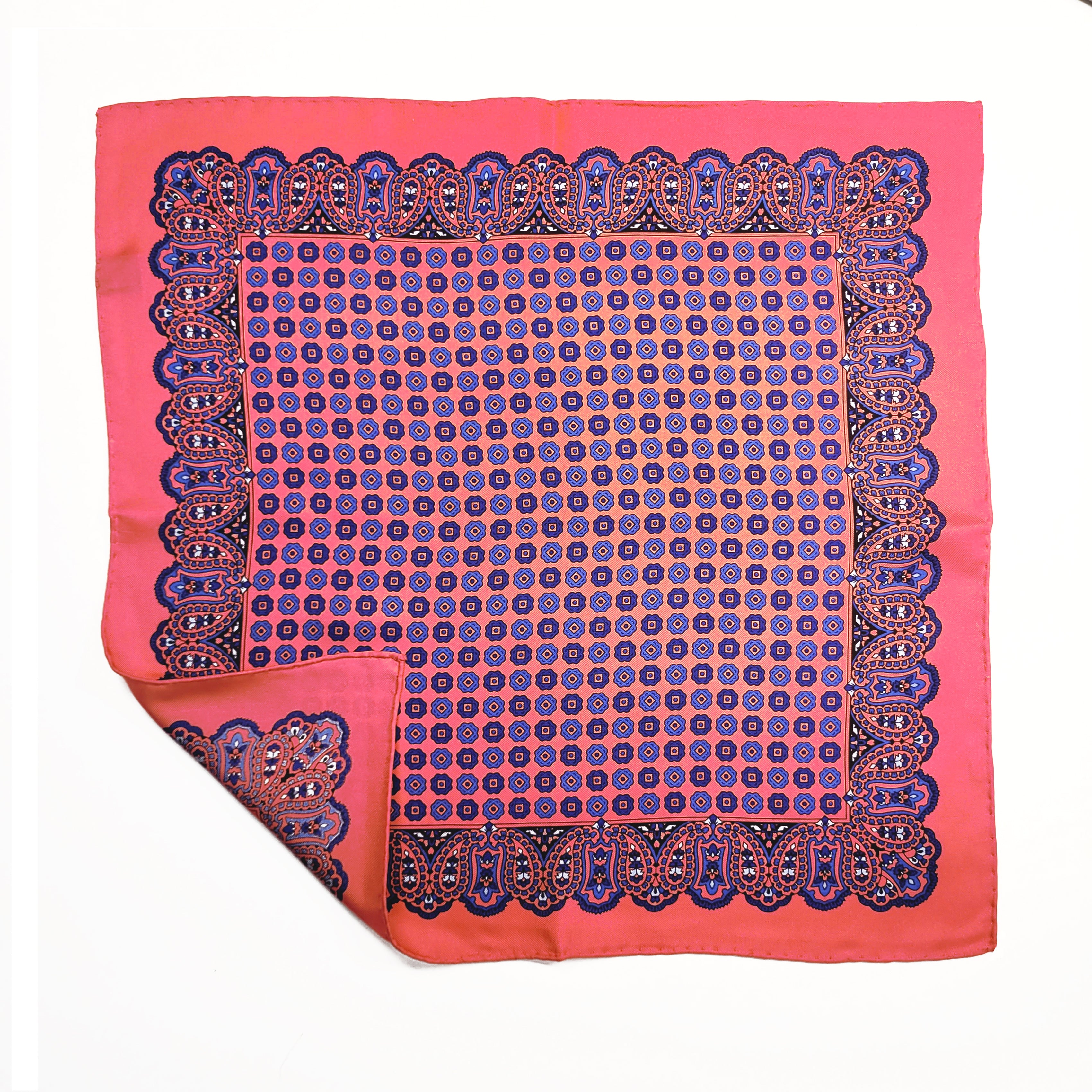 Pink Geometric Silk Pocket Square with Paisley Border