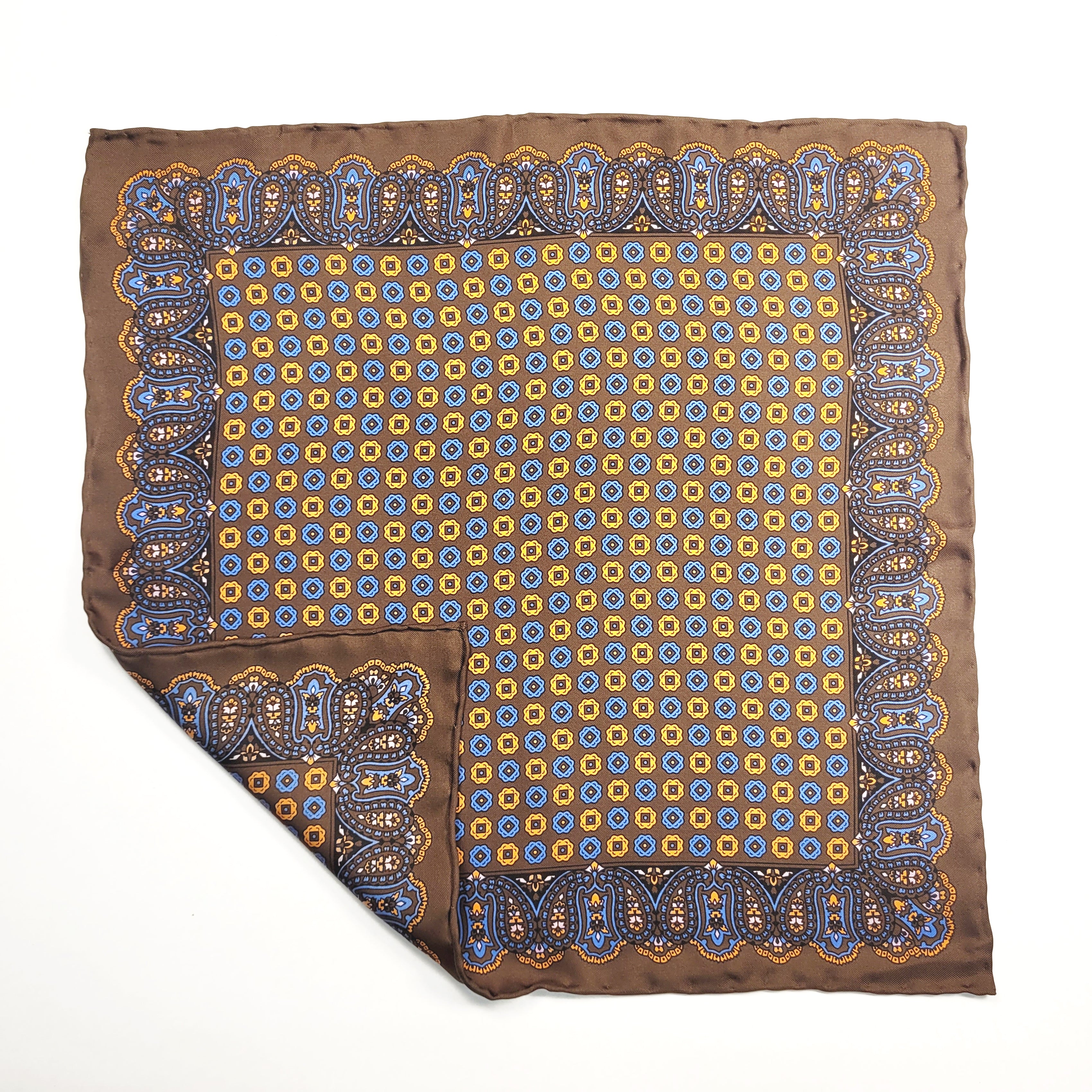 Brown Geometric Silk Pocket Square with Paisley Border