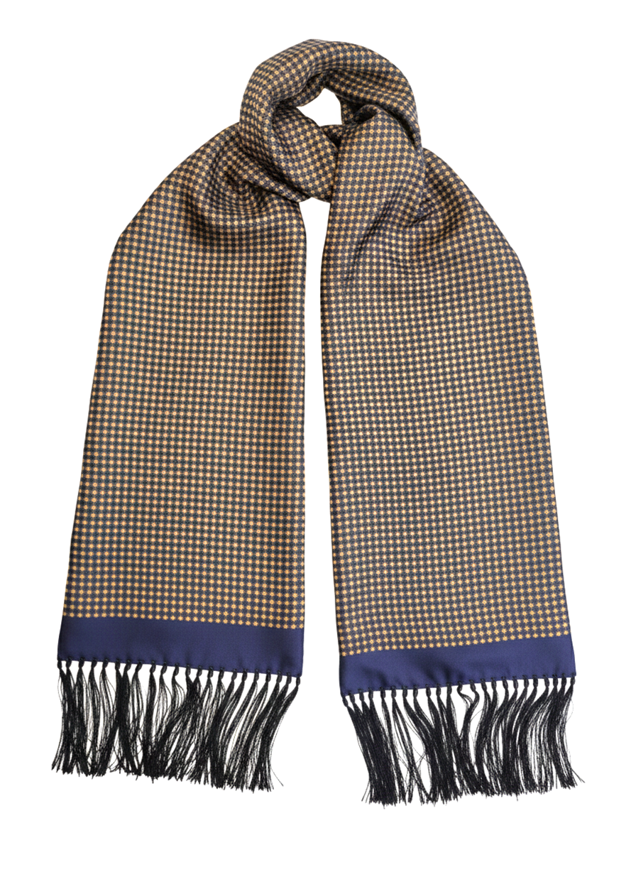 Navy and Mustard Checked Scarf with Hand Knotted Navy Tassels