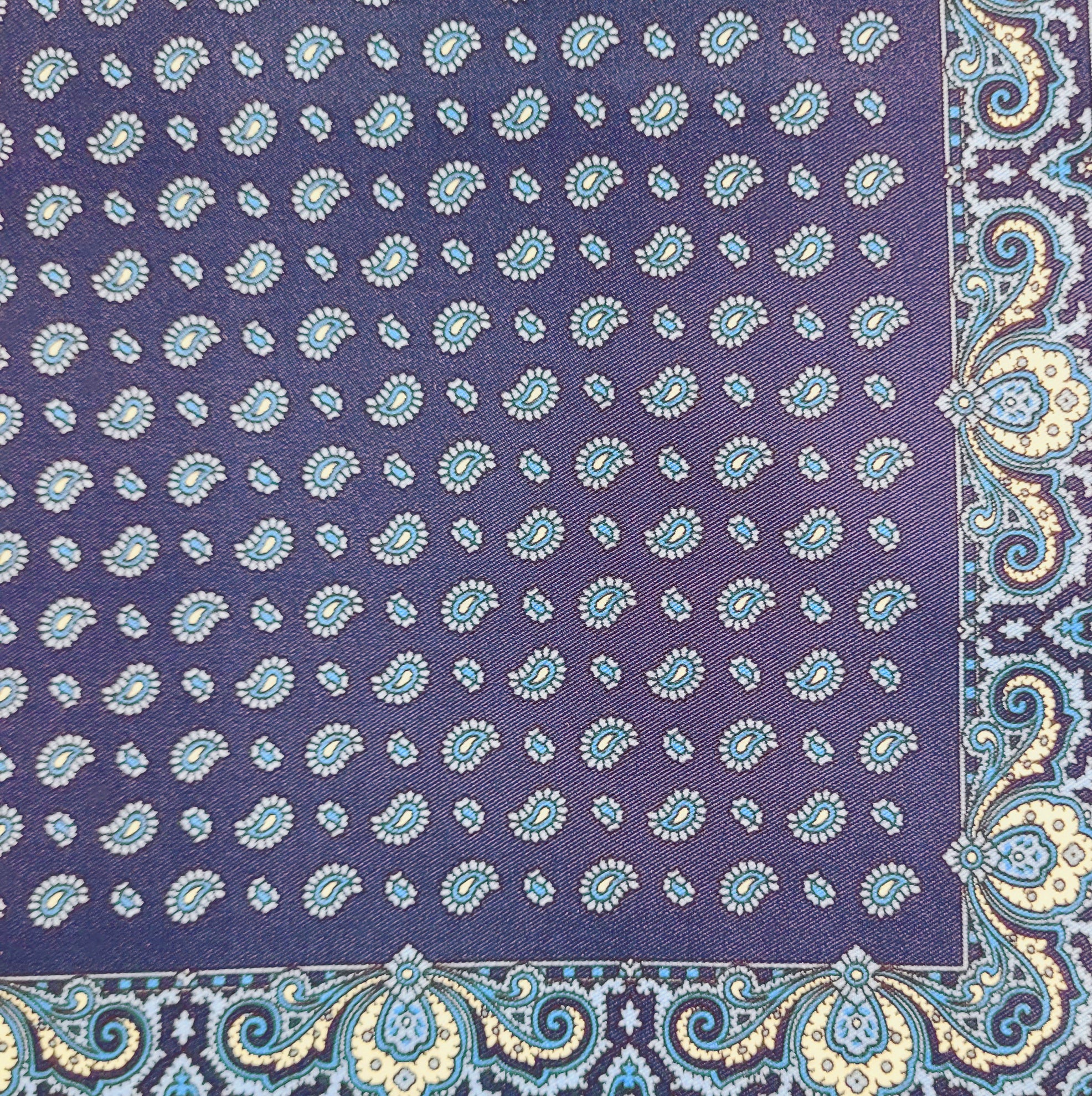 Navy Blue Tear Drop Silk Pocket Square With A Paisley Border