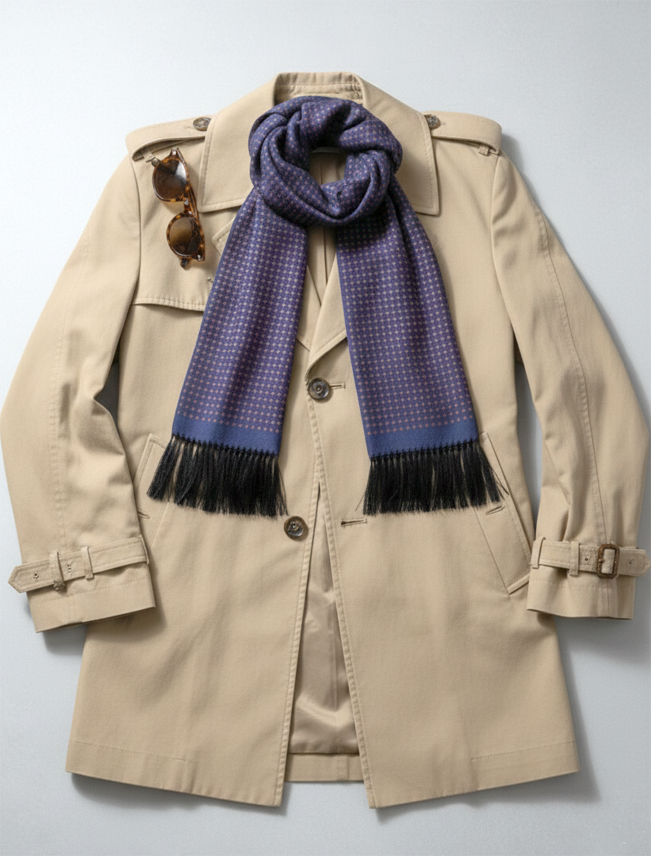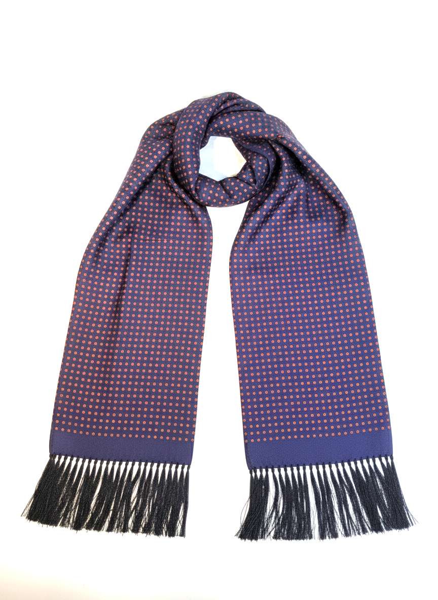 Navy & Red Geometric Silk Scarf with Hand Knotted Navy Tassels